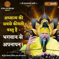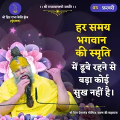 Pujya Shri Maharaj Ji encourages us to surrender completely to PriyaPriyatam. This unconditional surrender will help us attain Eternal Bliss (चिदानंद) or state of Prem (प्रेम) which can’t be provided even by the most rigorous and austere spiritual practice (साधना) because often despite of intense sadhana one may not completely overcome bodily consciousness (देह भाव) and the False Ego (अहंकार) both of which are detrimental in attaining pure love for PriyaPriyatam.